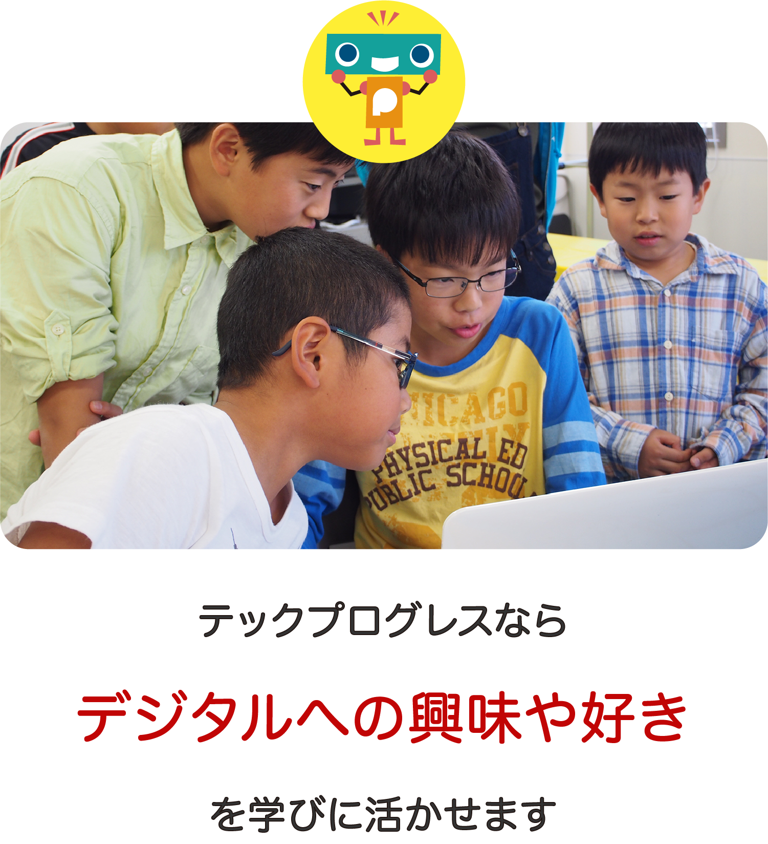 テックプログレスでは、デジタル(ゲームなど)大好きを生かして、将来に生きる学びに変えること、好奇心という学習意欲を伸ばしています。