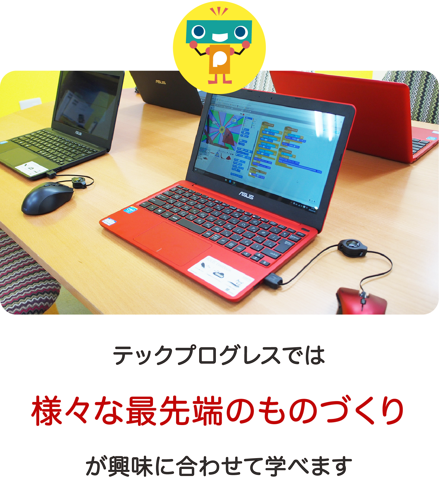 テックプログレスは、小学生がプログラミング、ロボット制御を学ぶ習いごと教室豊富な教材と子どもの学ぶ速度に合わせた個別カリキュラムで小学生高学年でも本格的なプログラミング言語を使って作品をつくれるようになります。